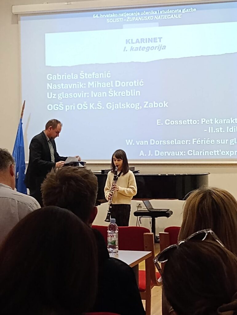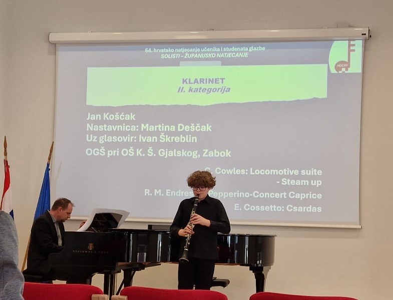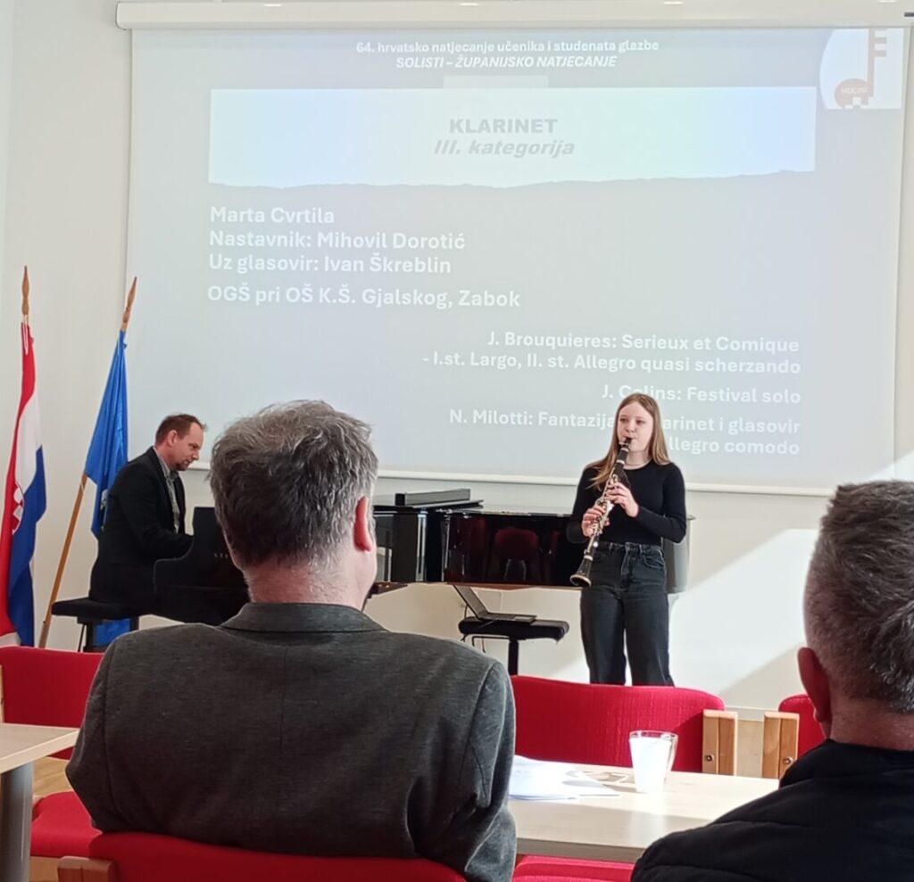 U srijedu 25. 2. i u četvrtak 26. 2. 2026. na 64. hrvatskom natjecanju učenika i studenata glazbe i plesa, regionalni dio, u Zagrebu u I. kategoriji, disciplini klarinet, naša učenica Gabriela Štefanić, 2. razred klarineta i u III. kategoriji učenica Marta Cvrtila 5. razred klarineta, prof. klarineta Mihovila Dorotića osvojile su dvije druge nagrade i učenica Ana Barlović, 3. razreda klarineta u I. kategoriji, prof. klarineta Martine Deščak, osvojila je također drugu nagradu dok je učenik Jan Košćak, 4. razred klarineta u II. kategoriji, prof. klarineta Martine Deščak, ostvario izvrstan rezultat i osvojio prvu nagradu, prvi plasman sa maksimalnih 100 bodova. Učenici prof. tube, trombona i roga Filipa Šeremeta, Matej Lojber, u III. kategoriji, disciplini tuba također je osvojio prvu nagradu dok je učenik Tin Horvatin, 6. razred eufonija u III. kategoriji osvojio drugu nagradu. Puno je truda u taj rezultat uloženo, a učenici Matej Lojber i Jan Košćak nastavljaju predstavljati našu školu i na 64. državnom hrvatskom natjecanju učenika i studenata glazbe i plesa u travnju ove godine. Čestitke najprije natjecateljima i njihovim obiteljima, zatim mentorima, korepetitorima prof. Ivanu Škreblinu i prof. Filipu Horvatu, svakako voditelju i ravnatelju Tomislavu i svima koji nas na razne načine prate, ohrabruju i podržavaju u daljnjem radu.