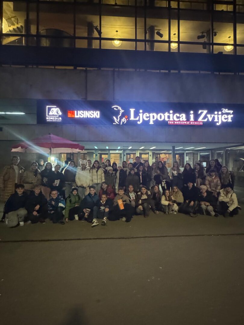 U subotu 17. siječnja 37-ero učenika petih i šestih razreda, polaznici Dramske grupe i Matematičke grupe, sa svojim učiteljicama Ivom Veverec, Višnjom Škreblin Valić, Anom Merkaš, Tinom Marušić i Irenom Novaković, pogledali su kazališni 150-minutni spektakl – mjuzikl „Ljepotica i Zvijer“ u kooprodukciji Zagrebačkog gradskog kazališta „Komedija“ i Disney Theatrical Productions. Prema klasičnoj bajci Charlesa Perraulta i svevremenskoj priči o naizgled nemogućoj ljubavi djevojke Belle i Zvijeri, odnosno začaranoga princa, osmišljen je mjuzikl koji je postavljen u Velikoj dvorani Koncertne dvorane „Vatroslav Lisinski“. Učenici su imali jedinstvenu priliku doživjeti kazalište u punom smislu te riječi – koloplet riječi, pjesama, plesa, izvrsne glazbe u glazbeno-scenskom spektaklu s mnogim dramskim i svjetlosnim efektima. Upoznali su neobične likove poput Lumierea, Din Dona, Gospođe Kamilice i Mrvice, Gospođe Komode ili Peruške, ulazili u maštovit svijet provincijskoga gradića ili začarane šume s dvorcem, prepoznavali osobine poput hvalisavoga Gastona, skromnog i otkačenog Mauricea, lijepe i svestrane Belle, tajanstvene, grube, ali i nježne Zvijeri. Čuli su jedne od najljepših klasičnih pjesama u izvedbi orkestra. U bezvremenskoj poruci da istinska ljubav pobjeđuje sve zlo i mračne kletve, kazalište u nama budi ono iskonsko – istinsku sreću zbog sretnoga završetka i pobjede dobra nad zlim. Učenici i učitelji bili su oduševljeni i zasigurno će im ovaj mjuzikl ostati u najboljem sjećanju! A tomu je svjedočio i zasluženi dugotrajni aplauz nakon predstave!